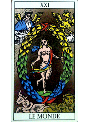 The World, of the universe, of the cosmos, of the source of nature, of the center of the universe, the "great fortune" since it contains the quaternity, allegories of the most important and essential of the world: the four kings of the animal kingdom, the bull is the king of cattle, the lion, the king of the jungle, the eagle, the king of the skies, and man-angel, the king of creation.